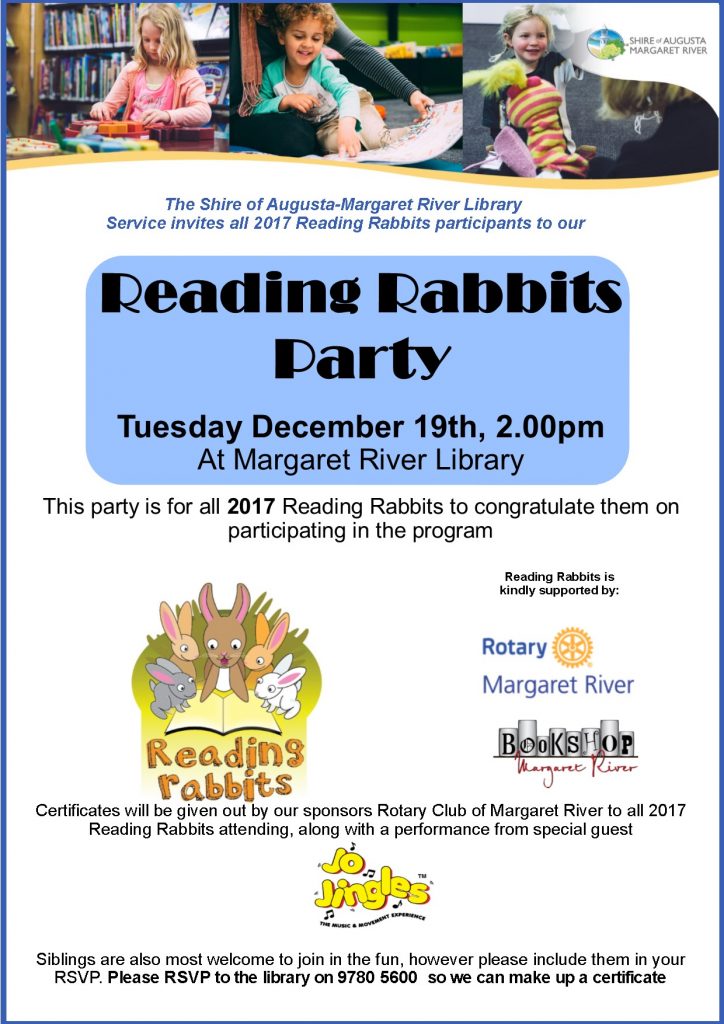 Calling all year one students! Come to the Margaret River Library to celebrate the end of year one and receive your certificate of participation for Reading Rabbits 2017. All Reading Rabbits and their siblings are invited and entertainment will be provided by Jo Jingles thanks to Rotary Club of Margaret River.