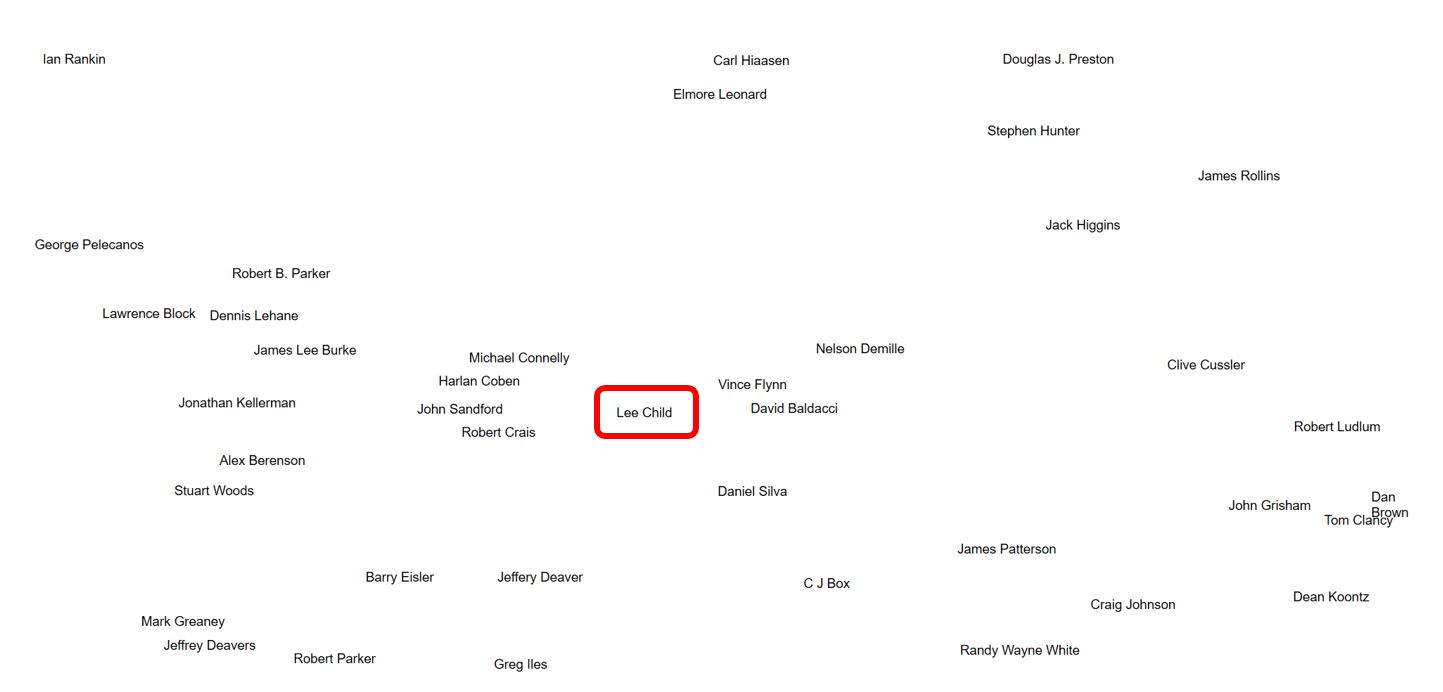 Click the search button and you’ll then be presented with a map of authors. The closer authors are to each other on the map, the more similar their styles are – so look for the names closest to your favourite author.